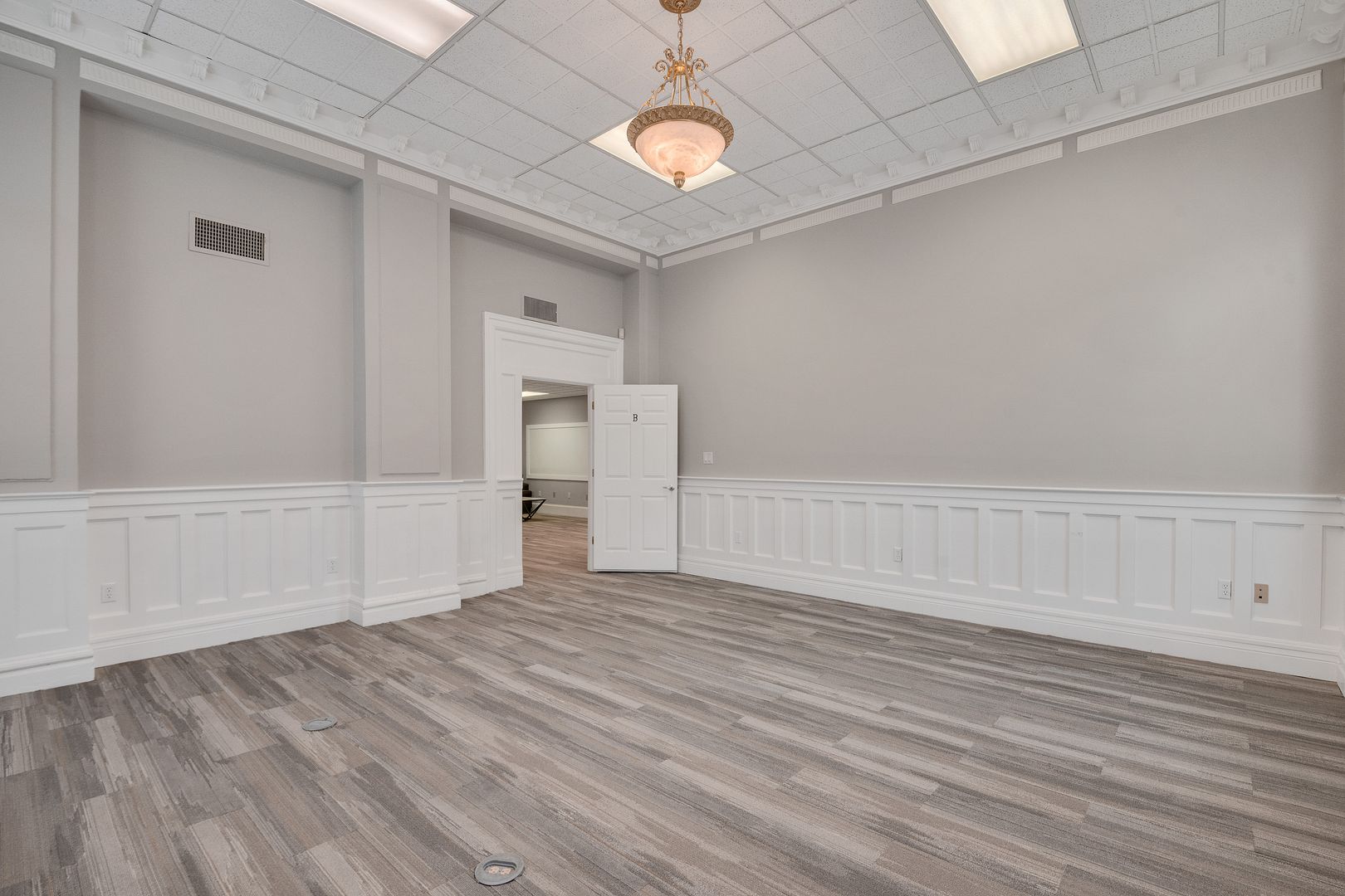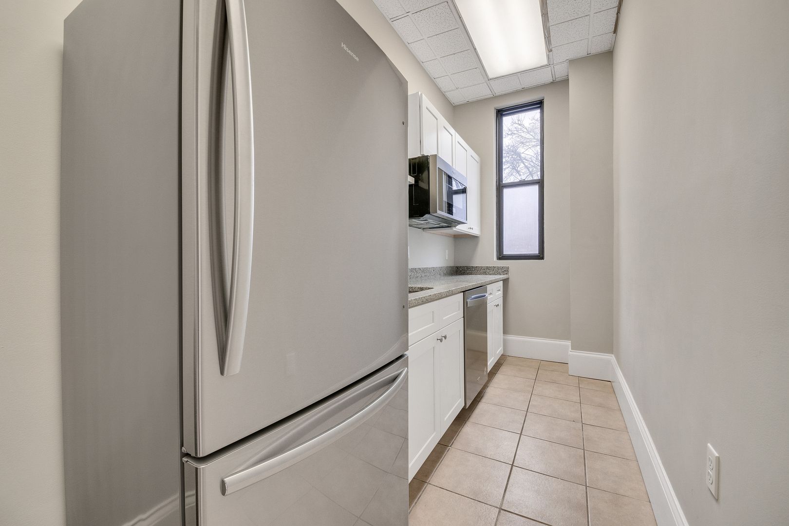 Private office has a shared common space that includes a bathroom, conference room, kitchen, and shared waiting area.