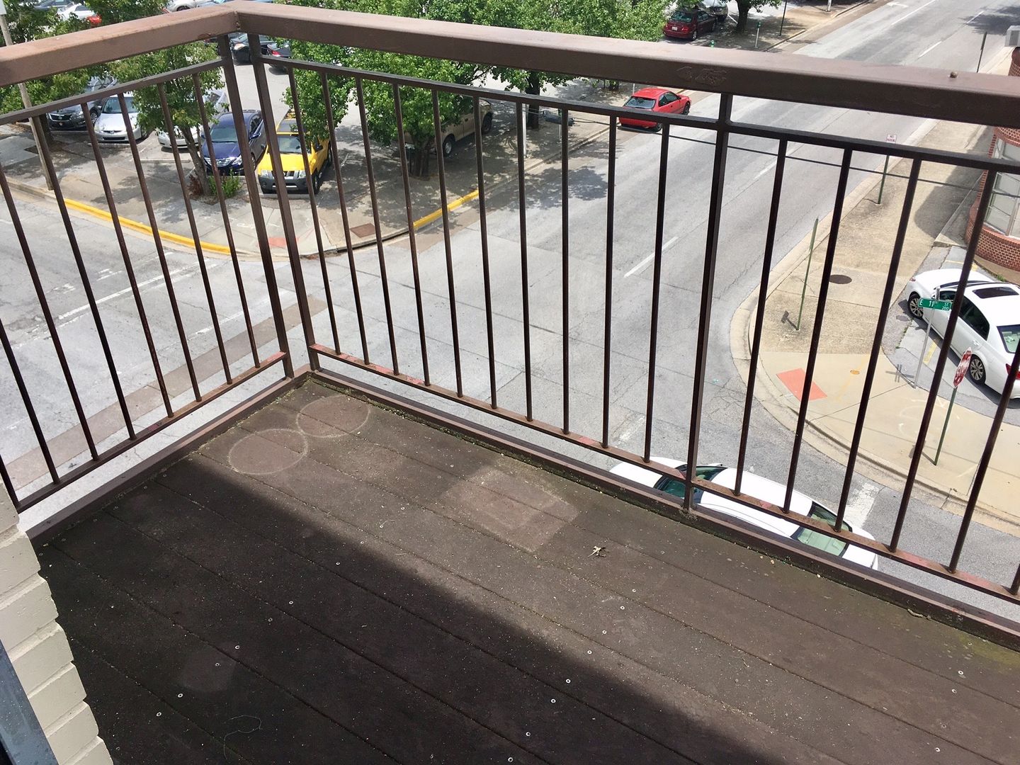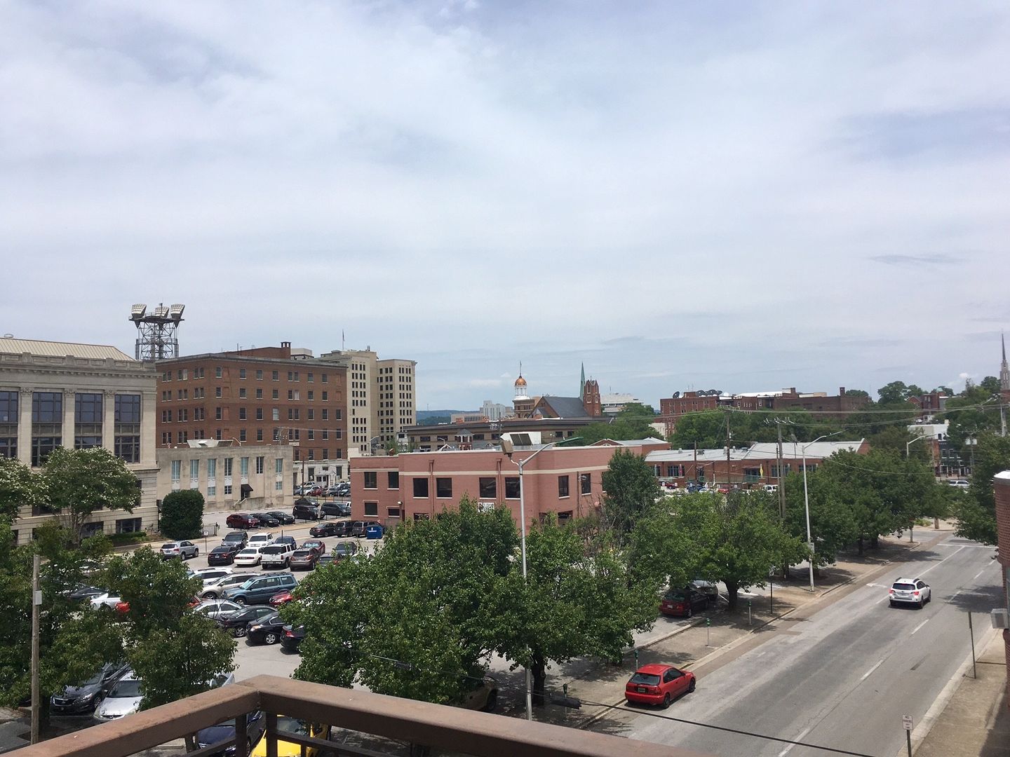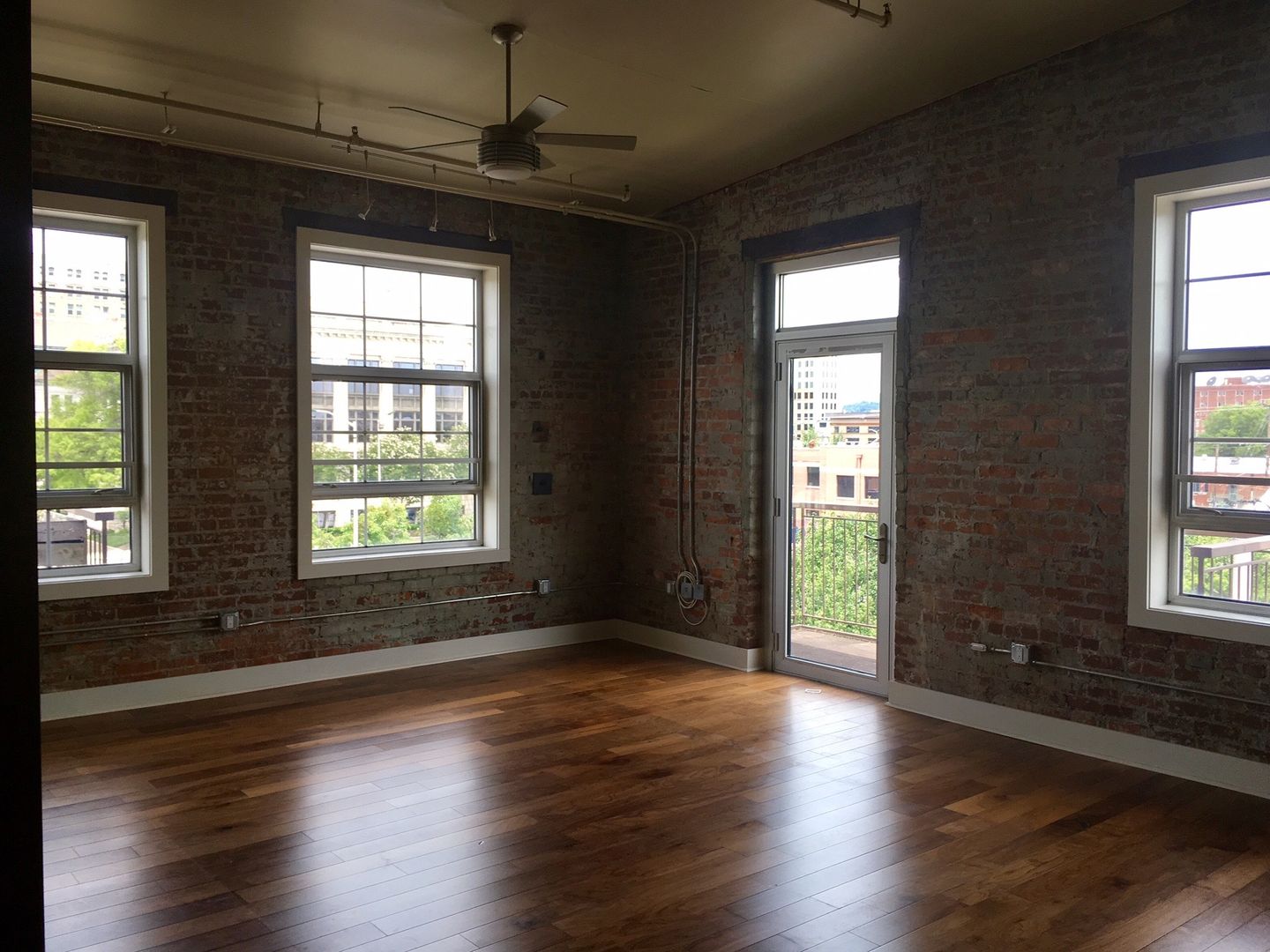 This spacious, urban two-bedroom apartment at Chattanooga's Fleetwood Building boasts large windows, tons of natural light, exposed brick, and two balconies - one facing downtown and one facing lookout mountain.