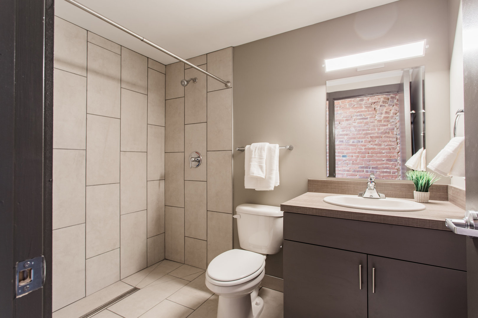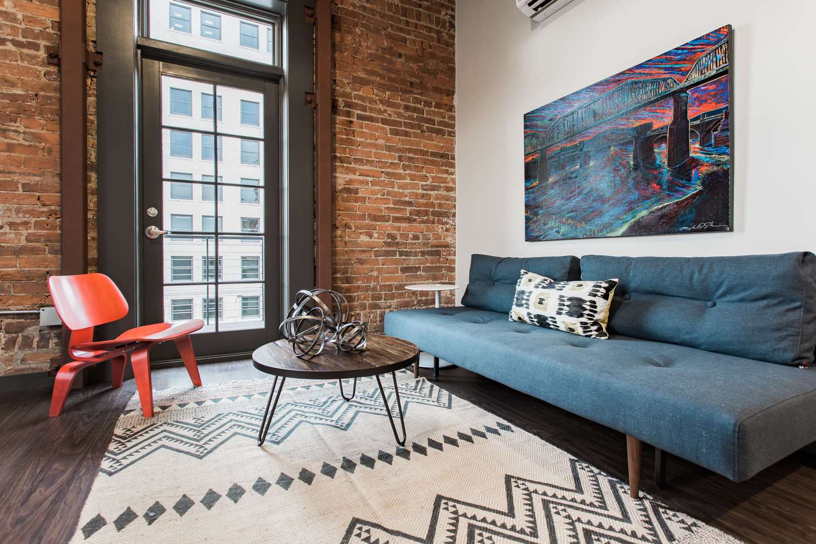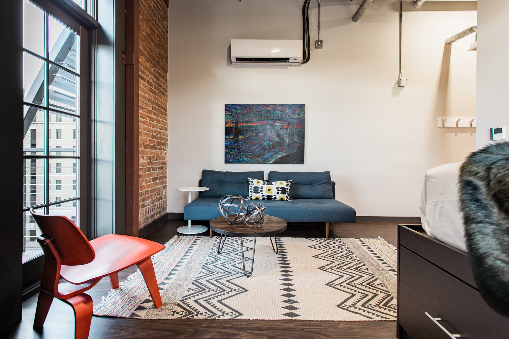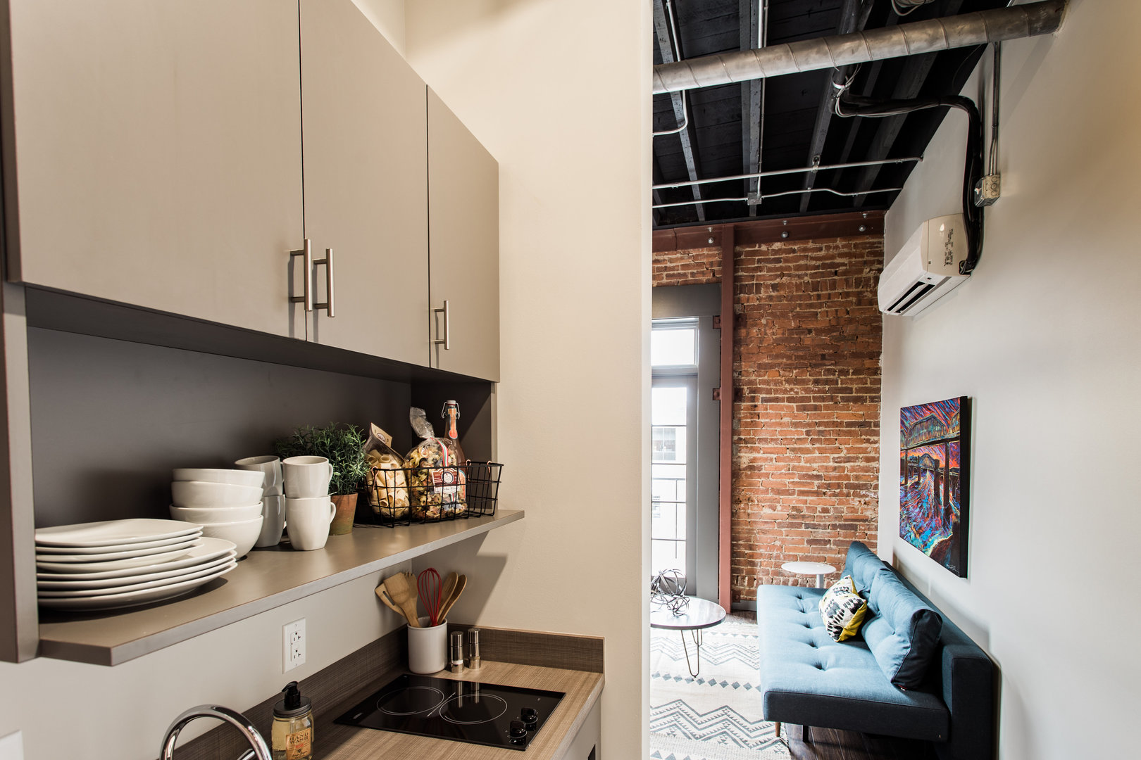 Apartment Features: Private bathroom with walk-in shower, kitchenette space with cooktop, sink and fridge, hardwood floors, high ceilings, large windows, exposed brick walls, a ceiling fan and furniture package.