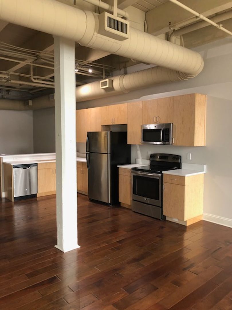This huge studio has approx. 860 sq. ft. and features exposed brick walls, factory exposed ceilings and hardwood flooring throughout. Large windows, tons of natural light, quartz countertops and stainless-steel appliances complete this beautiful studio. Enjoy a separate dining area and the convenience of full-size, in-unit washer and dryer!